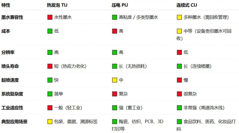 下面是喷墨技术三种类型(TIJ、PIJ、CIJ)性能对比表