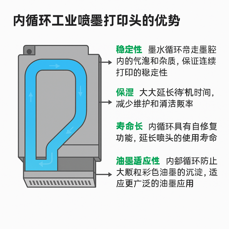 墨水在喷头内部持续循环,有助于防止沉淀物积聚、UV反射固化或其他导致喷嘴功能下降的因素,从而显著降低喷嘴堵塞、偏喷等问题的发生率。该特性使喷头具备一定的**“自清洁”与“自修复”能力**,延长整体使用寿命,降低更换频率。