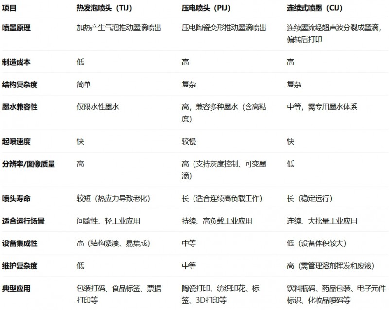热发泡喷墨(TIJ):适合对图像质量要求高、结构紧凑、成本敏感的场景,如标签打码、轻工业应用。
