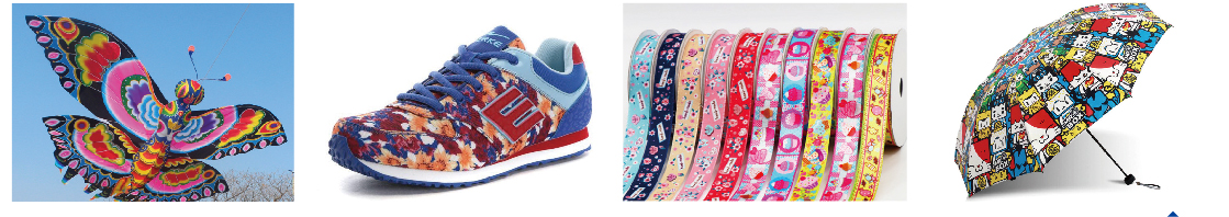 Application scope: clothing, toys, pillows, home textiles, bags, umbrellas, tents, sleeping mats, shoes and hats, mouse pads, carpets, yoga mats, kites, towels, headscarves, bronzing, webbing, lanyards, zippers, digital thermal sublimation printing of high-temperature resistant polyester chemical fiber fabrics, etc.