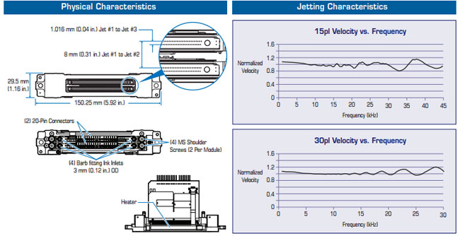 • The printhead is designed for binary jetting using a 15-picoliter native drop size with 8-meters per second nominal drop velocity for jetting fluids in the 8 to 20 centipoise range. Using VersaDrop jetting technology, the printhead is capable of adjustable binary operation at drop sizes up to 30 picoliters with resolutions up to 1000 dpi.
